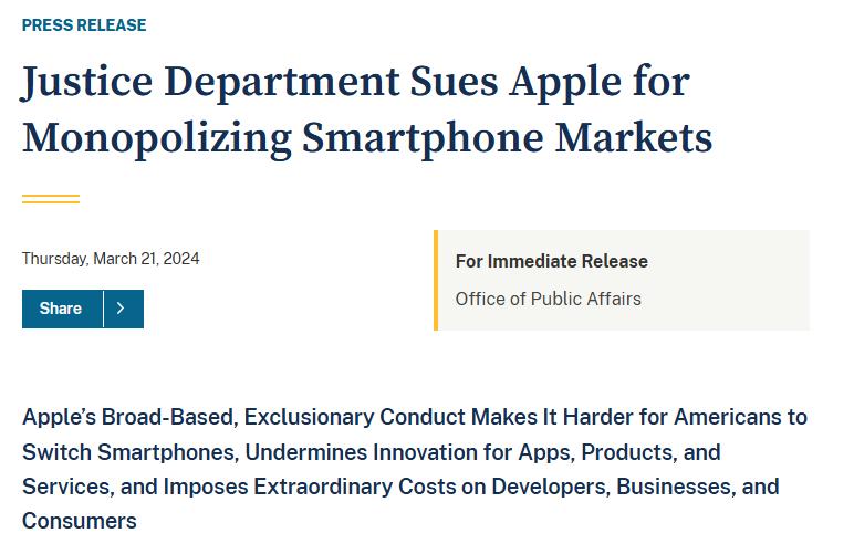 牆倒眾人推。就在蘋果向歐洲執行委員會示弱的兩個月後,美國司法部也與其他16個州的地區的檢察總長一起,對蘋果發起了民事反壟斷訴訟,指控蘋果違反《謝爾曼法案》第2條,壟斷或企圖壟斷智能手機市場。