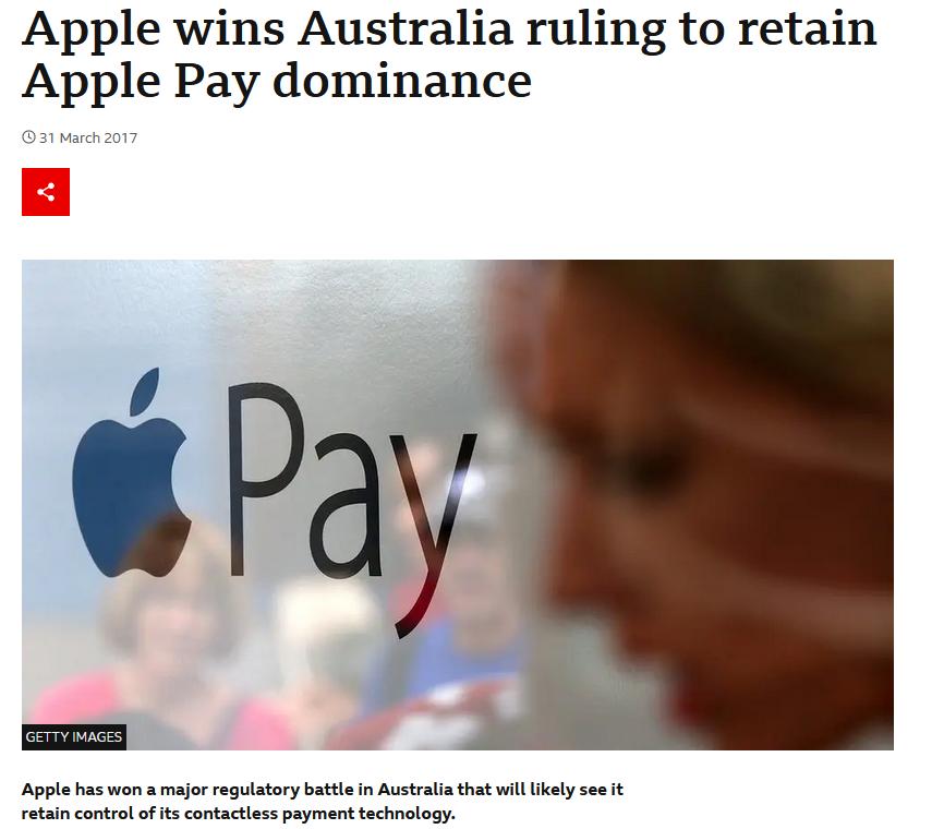 總之一句話,ACCC基於該技術尚處於起步階段,銀行前行入場NFC將阻礙創新和競爭的考慮,做出了有利於蘋果的裁決。