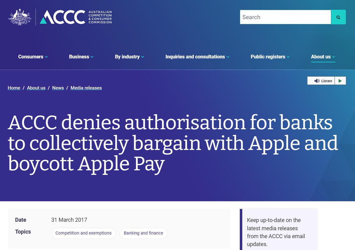 2017年,澳大利亞的五家銀行——澳洲聯邦銀行、西太平洋銀行、澳大利亞國民銀行、本迪戈銀行和阿德萊德銀行聯合起來,向監管機構——澳大利亞競爭和消費者委員會(以下簡稱ACCC)申請與蘋果公司進行集體談判,希望其自家的數字錢包能夠使用蘋果的NFC。