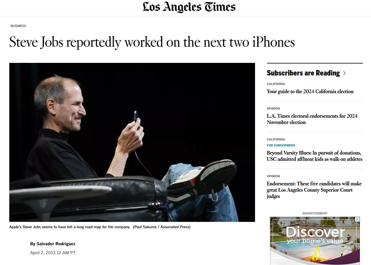 《洛杉磯時報》在2013年的報道,據悉喬布斯研發了後兩代iPhone