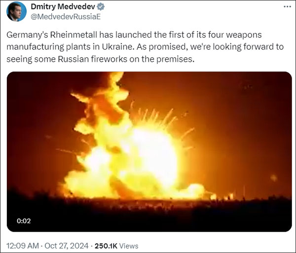 值得一提的是,萊茵金屬去年宣佈要在烏克蘭建設軍工廠時,梅德韋傑夫曾發文喊話:“座標發一下。”