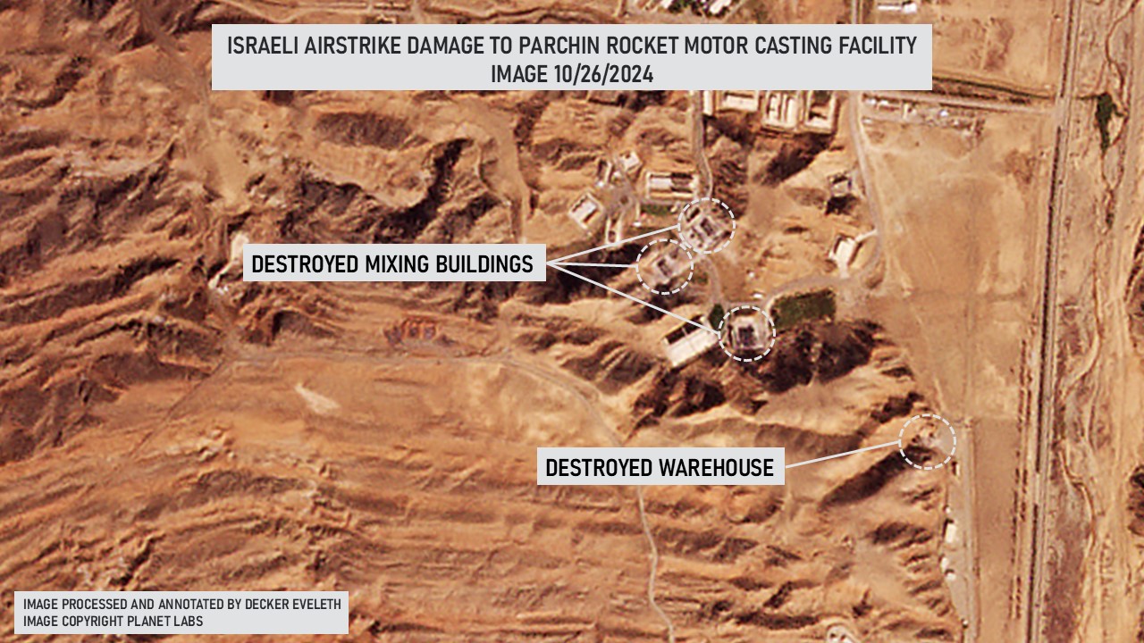 美國海軍分析中心(CNA)副研究分析師德克爾·埃弗利思(Decker Eveleth)告訴路透社,根據美國商業公司Planet Labs的衞星圖像,以色列擊中了帕爾欽基地裏的三座彈道導彈固體燃料混合建築和一座倉庫,以及科吉爾的兩處彈道導彈固體燃料混合設施。