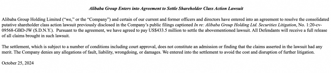 美國當地時間10月25日,阿里巴巴集團發佈公告,已同意支付4.335億美元(約合30.87億元人民幣)和解投資者在美國提起的一樁集體訴訟。
