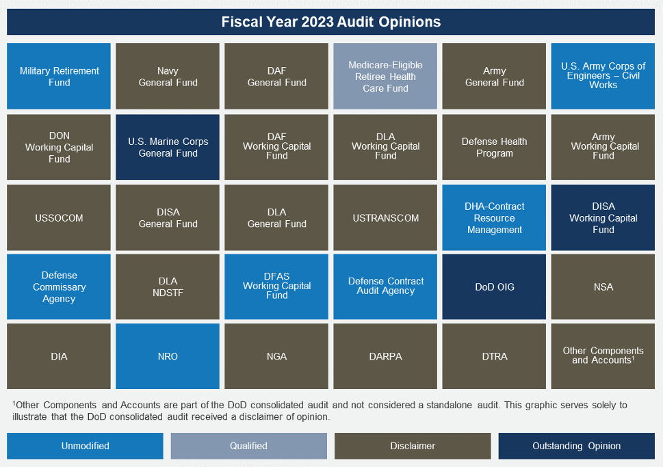 在針對國防部29個部門的獨立審計中,僅有7個取得了無保留意見【14】,即審計人員確定財務報表合理,符合公認的會計原則;1個是保留意見,即審計人員認為有未列入財報的錯報或未被發現的錯報可能性;3個是存在仍待解決的問題;18個收到了同上的免責聲明【15】,其中只有7個無保留意見涉及的問題相對次要。