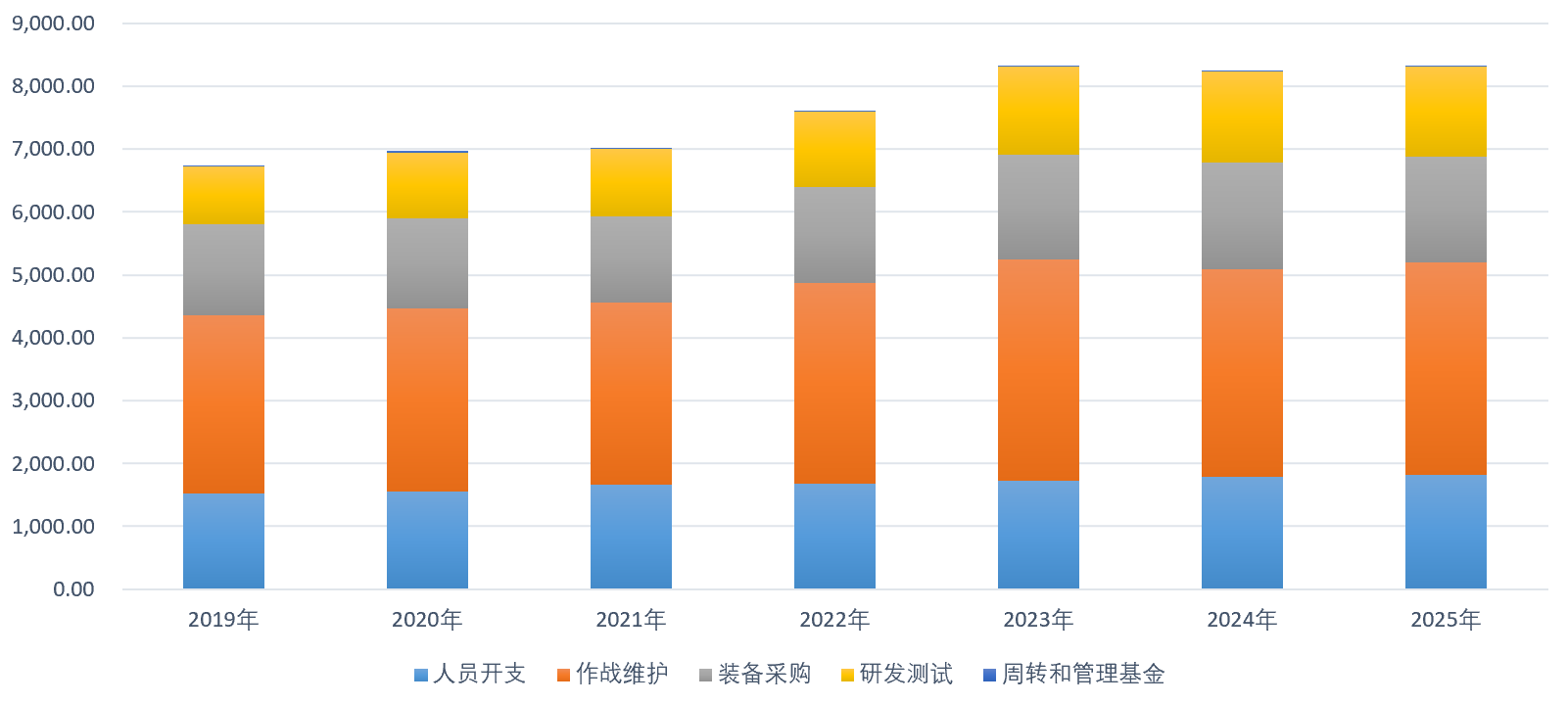 圖1.1 2019-2025財年美國國防預算的費用構成 數據來源:美國曆年國防預算
