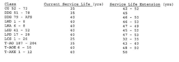 圖3.1 2018年網絡流出的美國海軍對各型水面艦艇擬議壽命延長的明細計劃