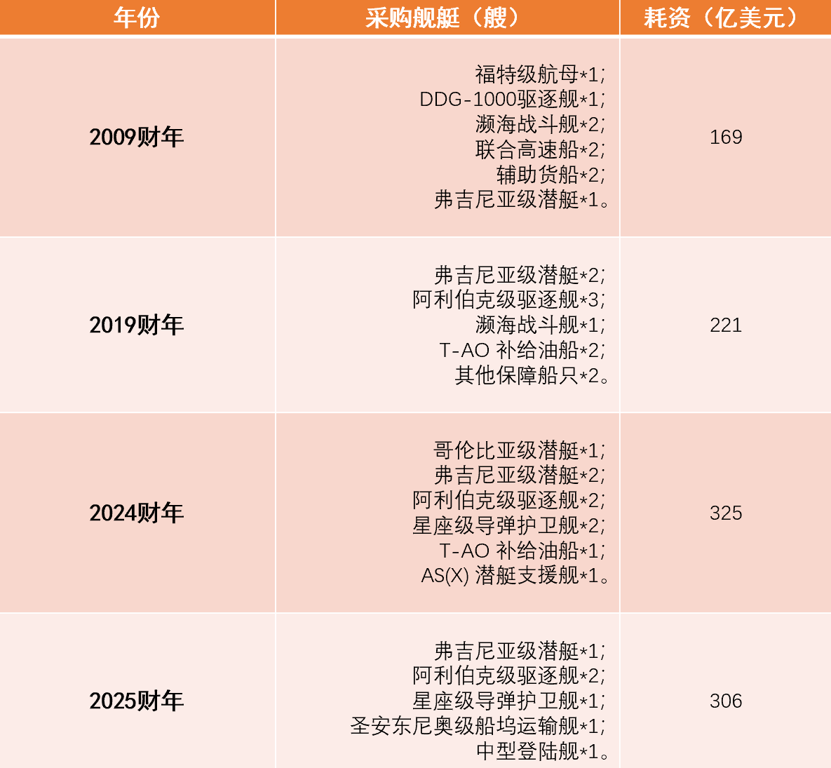 以海軍為例,2009財年,169億美元的預算編列了包括1艘福特級航母、1艘朱姆爾沃特級驅逐艦、1艘弗吉尼亞攻擊型核潛艇在內的9艘艦船建造計劃。2024財年擴充了近一倍的開支,新增包括核潛艇、驅護艦在內的艦艇依然還是9艘,不包含航母。2025財年和上一財年基本持平的開支,但只新增了6艘艦艇,且其中主戰艦艇只有4艘,還沒有航母、彈道導彈核潛艇這樣的戰略型兵器。