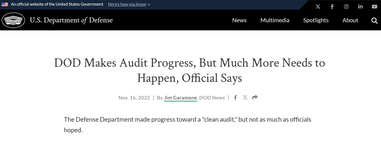 13.DOD News,DOD Makes Audit Progress, But Much More Needs to Happen, Official Says,https://www.defense.gov/News/News-Stories/Article/Article/3219566/dod-makes-audit-progress-but-much-more-needs-to-happen-official-says/,2022-11。