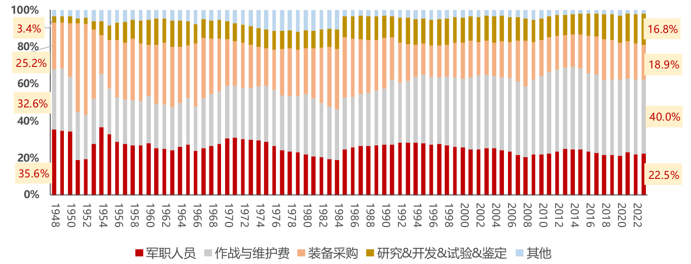 一、美國軍費怎麼花:“運營維護”一項獨大,人員、裝備、研發佔比持續走低