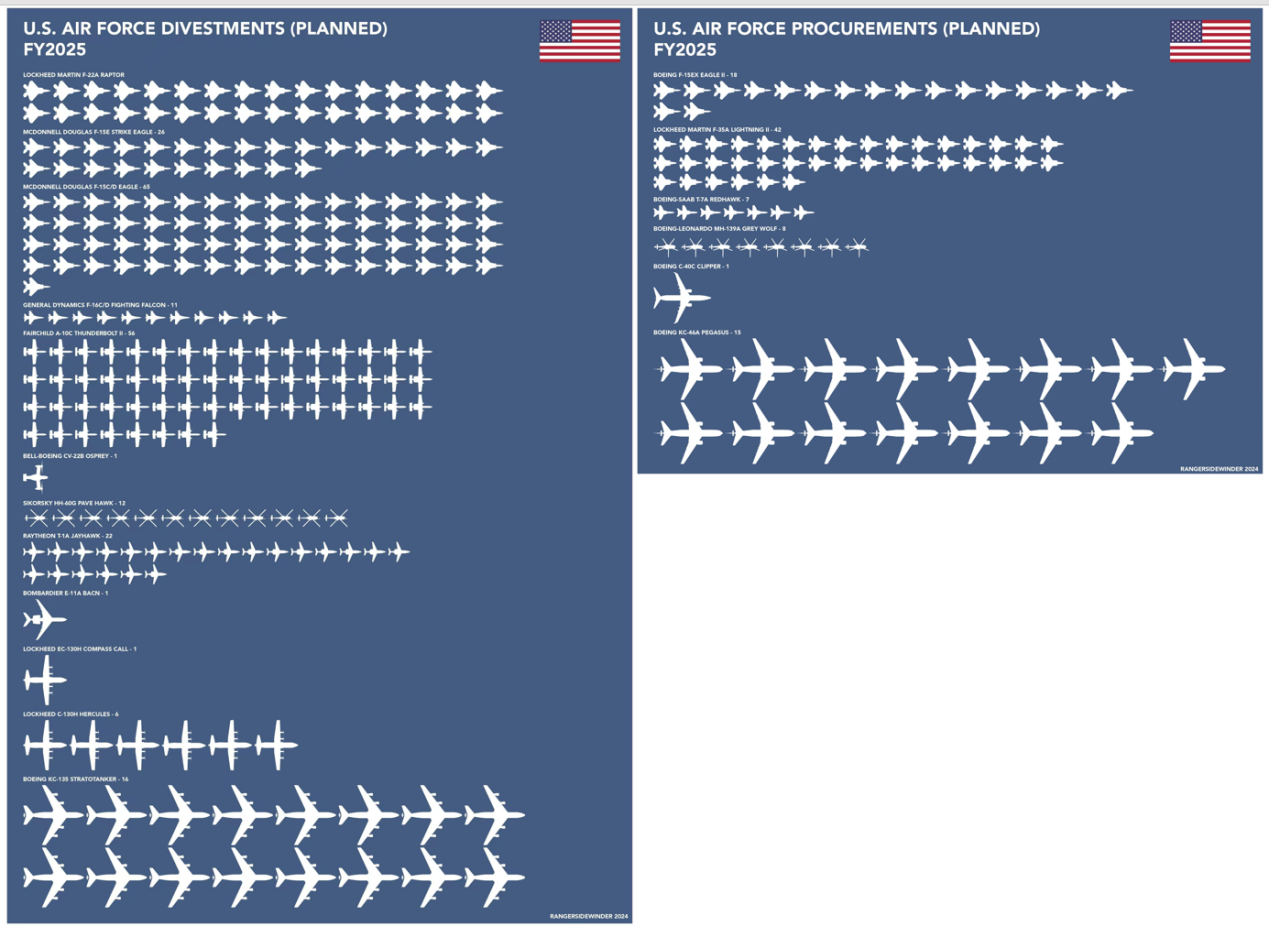 圖3.3 2025財年美國空軍擬退役(左)和服役(右)的軍用飛機對比根據美國2025財年預算自制的對比圖