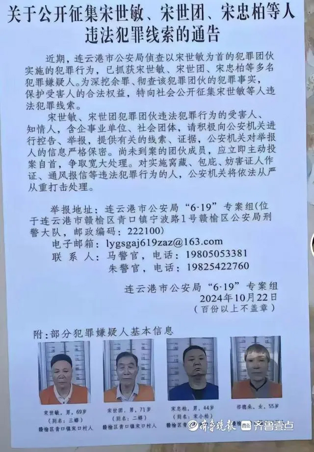 通告提到,近期連雲港市公安局偵查以宋世敏為首的犯罪團伙實施的犯罪行為,已抓獲宋世敏、宋世團、宋忠柏等多名犯罪嫌疑人。現向社會公開徵集宋世敏等人的違法犯罪線索,該團伙違法犯罪行為的受害人、知情人,含企事業單位、社會團體,請積極向公安機關控告、舉報,提供有關的線索、證據。