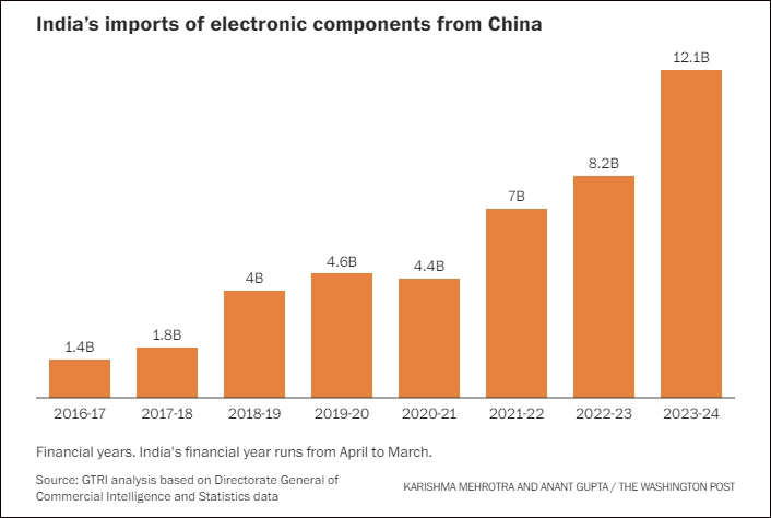 過去5年,印度從中國進口的電子元件數量增加了兩倍。 《華盛頓郵報》製圖