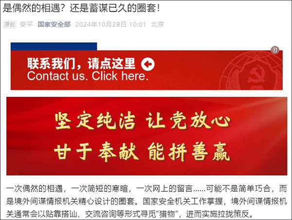 據微信公眾號“國家安全部”10月28日消息,一次偶然的相遇,一次簡短的寒暄,一次網上的留言……可能不是簡單巧合,而是境外間諜情報機關精心設計的圈套。國家安全機關工作掌握,境外間諜情報機關通常會以貼靠搭訕、交流諮詢等形式尋覓“獵物”,進而實施拉攏策反。