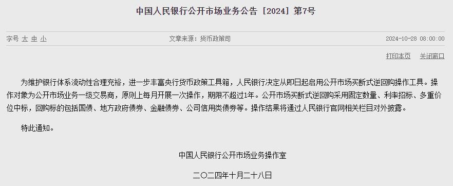 10月28日央行宣佈,為維護銀行體系流動性合理充裕,進一步豐富央行貨幣政策工具箱,人民銀行決定從即日起啓用公開市場買斷式逆回購操作工具。操作對象為公開市場業務一級交易商,原則上每月開展一次操作,期限不超過1年。公開市場買斷式逆回購採用固定數量、利率招標、多重價位中標,回購標的包括國債、地方政府債券、金融債券、公司信用類債券等。操作結果將通過人民銀行官網相關欄目對外披露。
