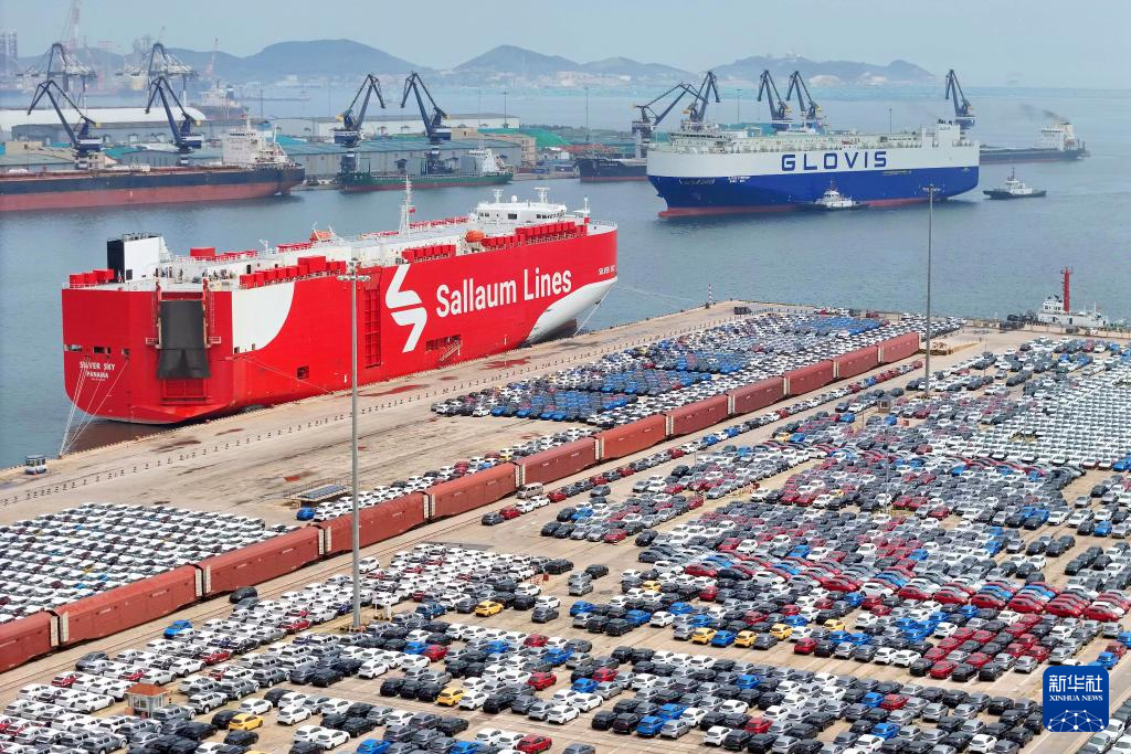 在山東港口煙台港,滾裝船在裝運外貿車輛。資料圖:新華社