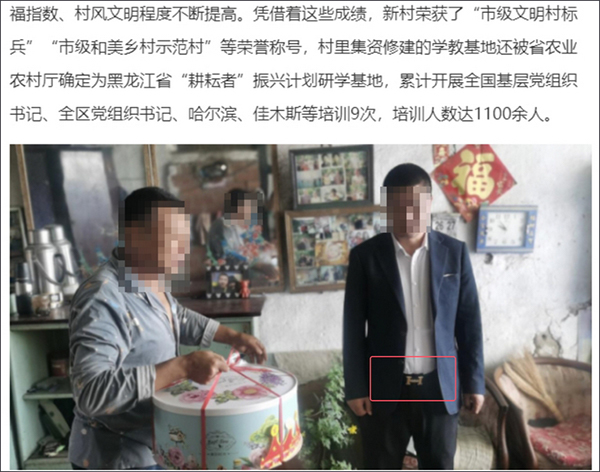 10月27日發表的一篇名為《情繫羣眾,無私奉獻——記大慶市大同區林源鎮新村黨支部書記王**》的報道引發關注。有網民稱,報道里配發的多張照片顯示,疑似村支書到羣眾家中慰問時,開着百萬豪車、繫着愛馬仕皮帶。