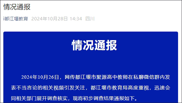 2024年10月26日,網傳都江堰市聚源高中教師在私聊微信羣內發表不當言論的相關視頻引發關注,都江堰市教育局高度重視,迅速會同相關部門展開調查核實,現將初步調查結果通報如下。