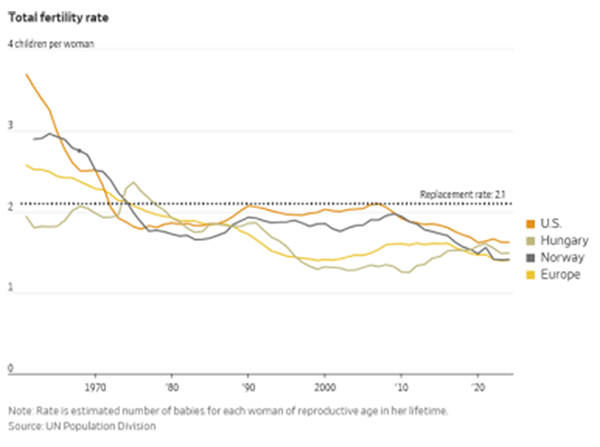 《華爾街日報》報道,根據經濟合作與發展組織的數據,匈牙利和挪威在促進生育上的投入超過GDP的3%,超過了他們在軍隊上的支出。