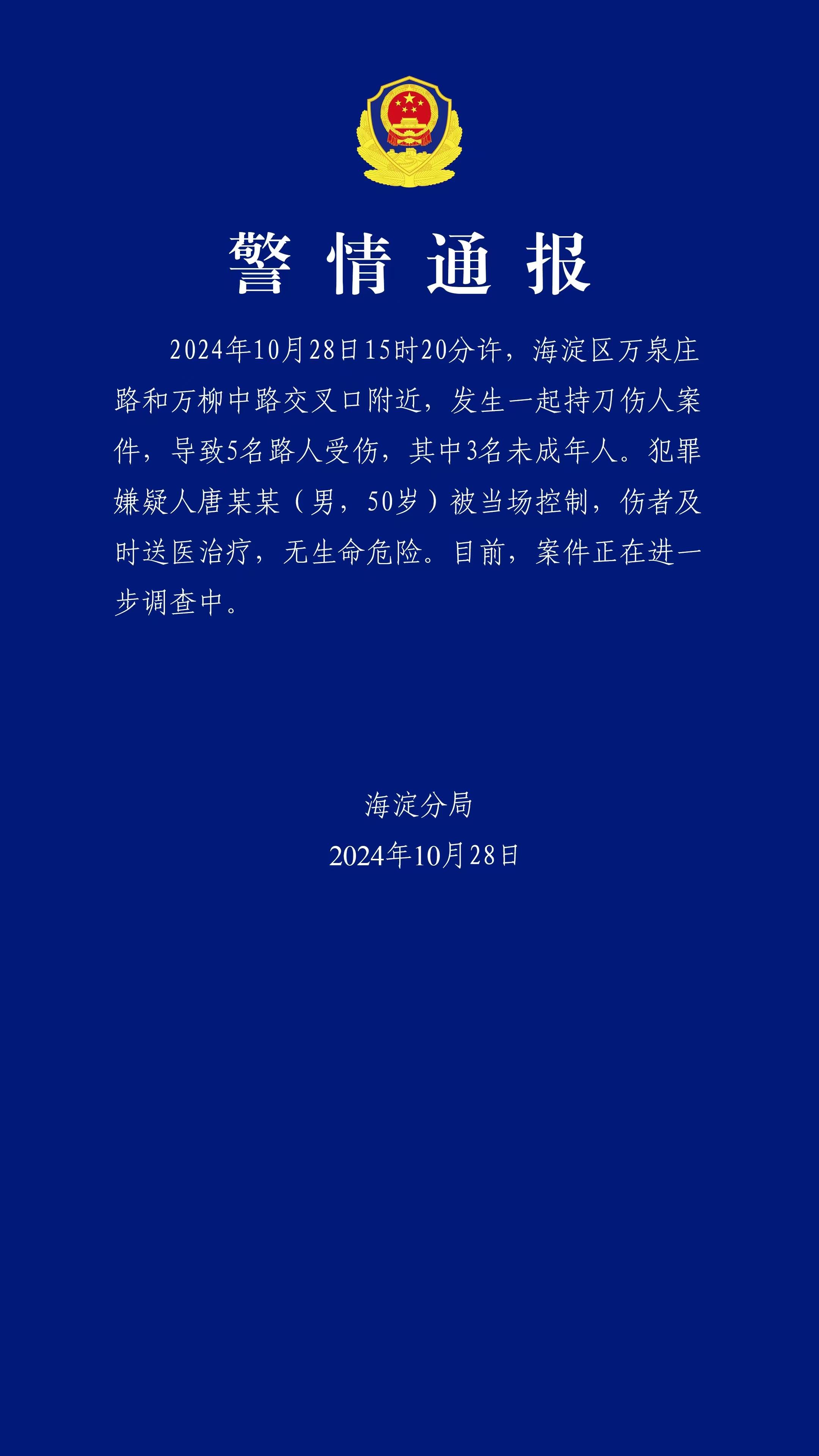 2024年10月28日15時20分許,海淀區萬泉莊路和萬柳中路交叉口附近,發生一起持刀傷人案件,導致5名路人受傷,其中3名未成年人。犯罪嫌疑人唐某某(男,50歲)被當場控制,傷者及時送醫治療,無生命危險。目前,案件正在進一步調查中。