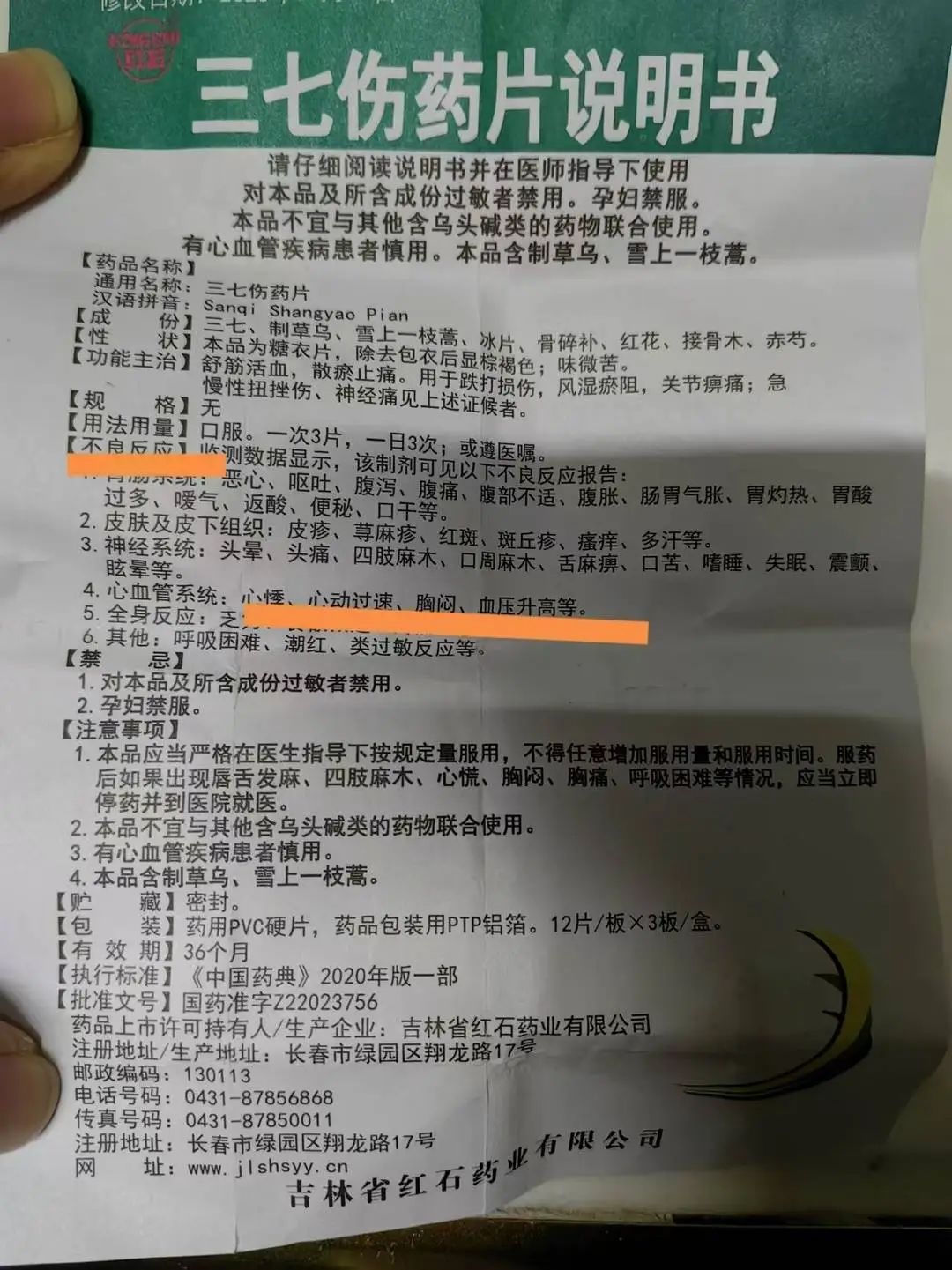 武漢某三甲醫院藥劑專業人士介紹,三七傷藥片是一種祛濕止痛的中藥,屬於處方藥。而制草烏和雪上一枝蒿都屬毒性成分,藥性較烈,與其他不能同時使用的藥品、食品混合使用,以及給禁忌症者使用,都會產生嚴重後果,需要醫生嚴格指導,藥店嚴格按照處方銷售。