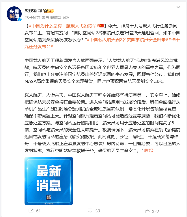 “載人航天,人命關天。中國載人航天工程全線始終堅持質量第一、安全至上,始終把確保航天員安全擺在首要位置。進入空間站應用與發展階段後,我們全面推行從單機產品生產到發射場總裝測試的全流程質量確認制,常態化開展各項複核複查,確保不帶問題上天。針對空間碎片撞擊空間站可能造成泄露等威脅,我們不斷優化應急處置方案,與空間站運行初期相比,航天員可用於應急處置的時間提高了5倍,空間站與航天員的安全性大幅提升。極端情況下,航天員可搭乘在軌飛船提前返回或發射待命的應急飛船實施救援,此時此刻,長征二號F遙二十運載火箭與神舟二十號載人飛船正在酒泉發射中心總裝廠房內待命,一旦有必要,可以迅速轉入發射狀態,執行空間站應急救援任務,確保航天員生命安全。”