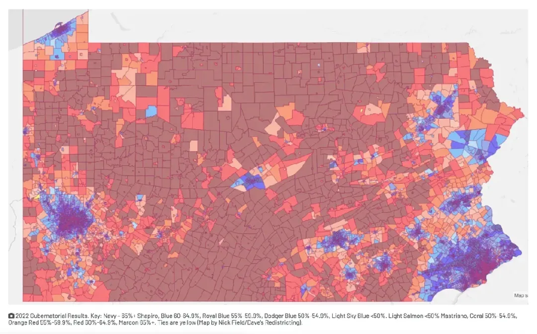 這是賓夕法尼亞州2022年州長選舉中民主黨州長喬什·沙皮羅(Josh Shapiro)壓倒性勝利時的選舉地圖。