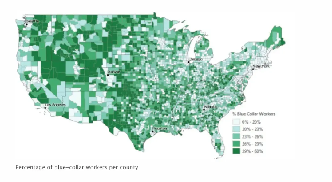 並非所有傾向於支持特朗普的縣都擁有大量的工人階級選民羣體,但在賓夕法尼亞州中部和西弗吉尼亞州的一些關鍵縣,這兩個因素有所重合。這些地區不僅顯示出工人階級選民與特朗普選票之間的高度相關性,而且工人階級選民的比例也明顯高於其他地區。