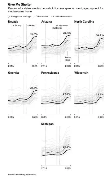 “傳統理解通常認為,要抓住這些搖擺選民的心智,關鍵在於承諾復興製造業……然而如今,住房可負擔性更可能在選民中間產生更有力的反響。彭博經濟的計算顯示,自2016年以來,在陽光地帶州,例如亞利桑那、佐治亞、內華達和北卡來羅納,中等住房的按揭支付成本差不多翻了一番,達到了收入中位數的三分之一或更多。在產業州,例如密歇根、賓夕法尼亞和威斯康星,中位數家庭將其收入的大約五分之一用於支付中等價位房屋的按揭貸款。自2016年以來,這些州的住房成本也近乎翻了一番。”