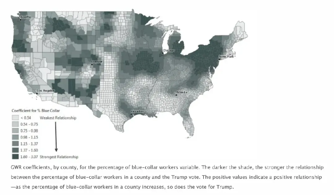 然而,當時以及此後較少被注意的是,不僅僅2016年之後工人階層選民傾向於支持特朗普;對於克林頓以及民主黨人打擊更大的則是,鏽帶(rust belt)州的工人階層選民支持特朗普的比例甚至高於全國水平。換句話説,在這些地方的政治背景下,特朗普的競選信息能產生了特別強烈的共鳴。地方層面的階層對立或是有針對性的競選活動可能造成了這樣的效果。