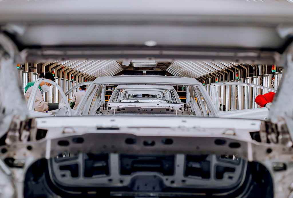 2022年12月,一汽大眾華東基地焊裝車間,工人對焊接質量進行檢查。視覺中國