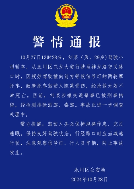 重慶市永川區公安局微信公眾號“永川公安”10月28日發佈警情通報稱,10月27日13時28分,劉某(男,29歲)駕駛小型轎車,從永川區興龍大道行駛至神龍路交叉路口時,因疲勞駕駛撞向前方等候信號燈的兩輪摩托車,致摩托車駕駛人陳某受傷,經搶救無效不幸死亡。