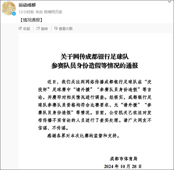 成都市體育局官方微博@運動成都 10月28日發佈情況通報稱,近日,我們關注到網絡傳播成都銀行足球隊在“交投杯”足球賽中“請外援”“參賽隊員身份造假”等言論,並賡即對相關情況進行調查。經核實,成都銀行足球隊參賽隊員資格均符合比賽要求,無“請外援”“參賽隊員身份造假”等情況。