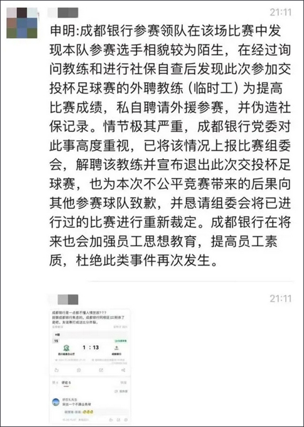 據微信公眾號“正在新聞”此前報道,網傳2024年成都交投杯足球賽小組賽中,成都銀行的外聘教練為提高比賽成績,私自聘請外援參賽,並偽造社保記錄。