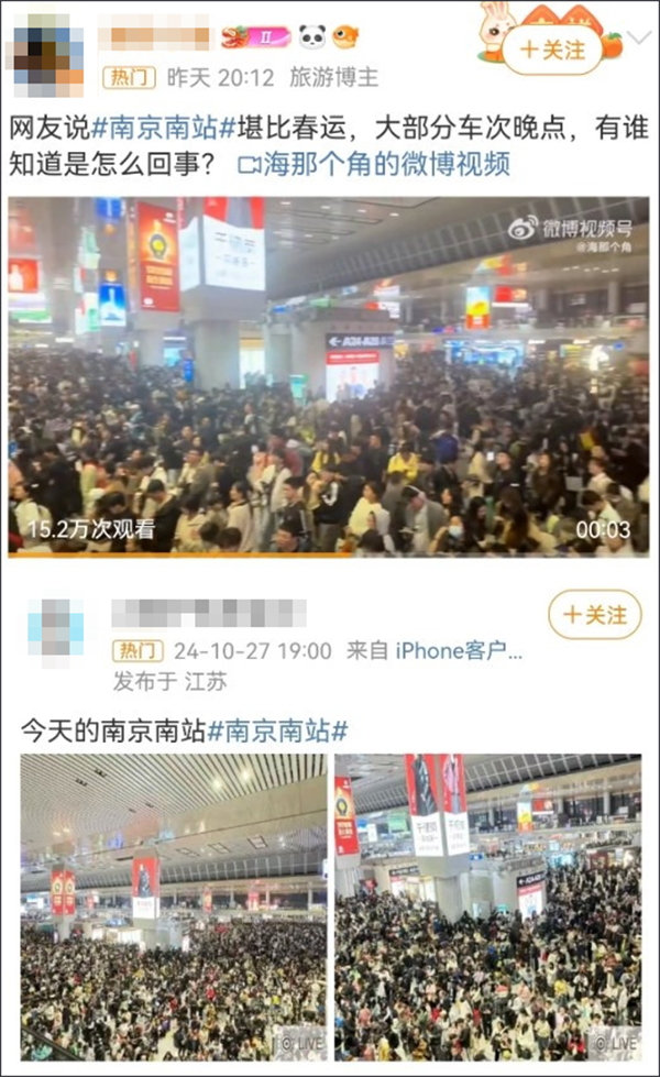 此前,10月27日,南京南站多車次列車晚點,涉及上海、徐州、鄭州等多個方向。不少網友發佈了現場視頻和圖片,其中可以看到,南京南站的站廳內擠滿了人。有網友感嘆“堪比春運”。