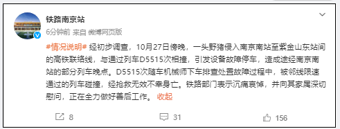 經初步調查,10月27日傍晚,一頭野豬侵入南京南站至紫金山東站間的高鐵聯絡線,與通過列車D5515次相撞,引發設備故障停車,造成途經南京南站的部分列車晚點。D5515次隨車機械師下車排查處置故障過程中,被鄰線限速通過的列車碰撞,經搶救無效不幸身亡。鐵路部門表示沉痛哀悼,並向其家屬深切慰問,正在全力做好善後工作。