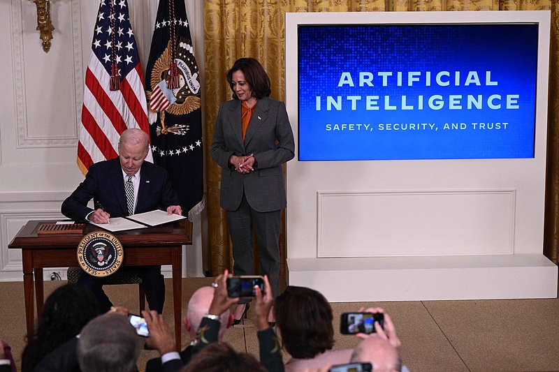 當地時間2023年10月30日,美國副總統哈里斯在白宮東廳發表關於推進人工智能安全、可靠和可信賴發展和使用的講話後,美國總統拜登簽署行政命令。 視覺中國資料圖