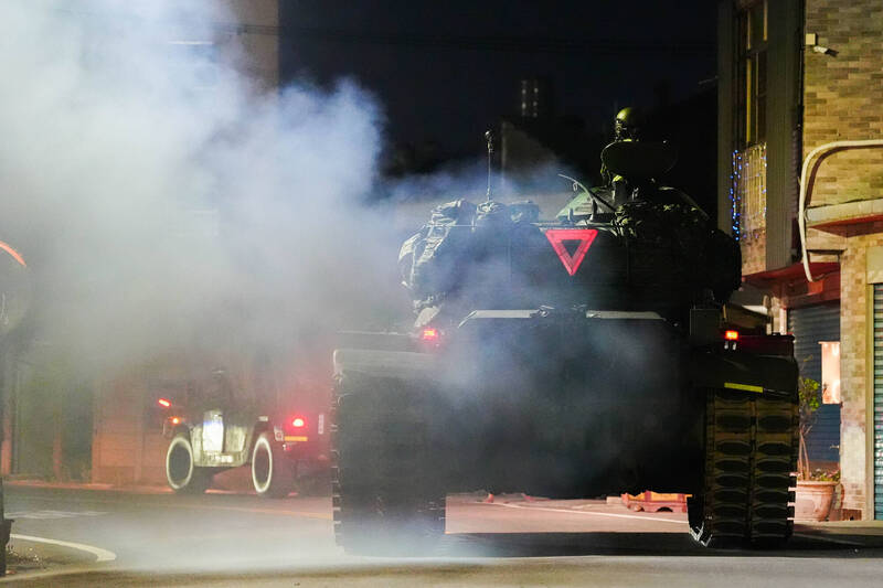 在本次演習中,333旅擔負進攻任務,擔任守軍的是586旅。586旅裝備M60A3坦克和“雲豹”坦克。而六軍團的指揮部人員在臨時統裁部下達指令。在演練中,台媒記者發現,在586旅聯兵1營營長受領任務後,6輛M60A3戰車立刻機動前往在則宮廟實施整備,並在鄰近的慈航宮遭遇擔任攻擊軍的333旅。