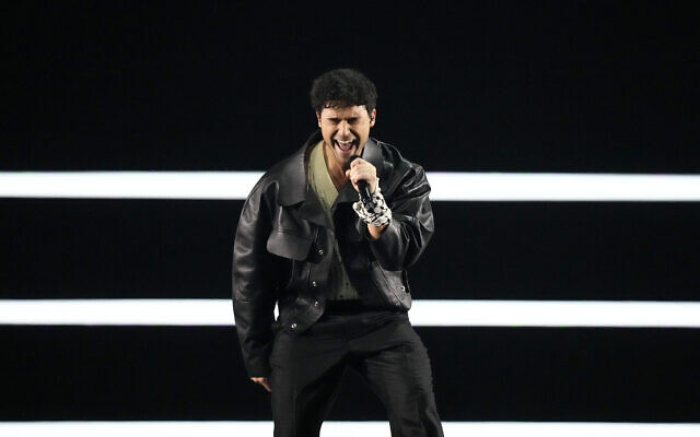 當地時間2024年5月7日,在瑞典舉辦的歐洲歌唱大賽上,瑞典參賽者埃裏奇·薩德手綁阿拉伯頭巾上台演唱。 美聯社