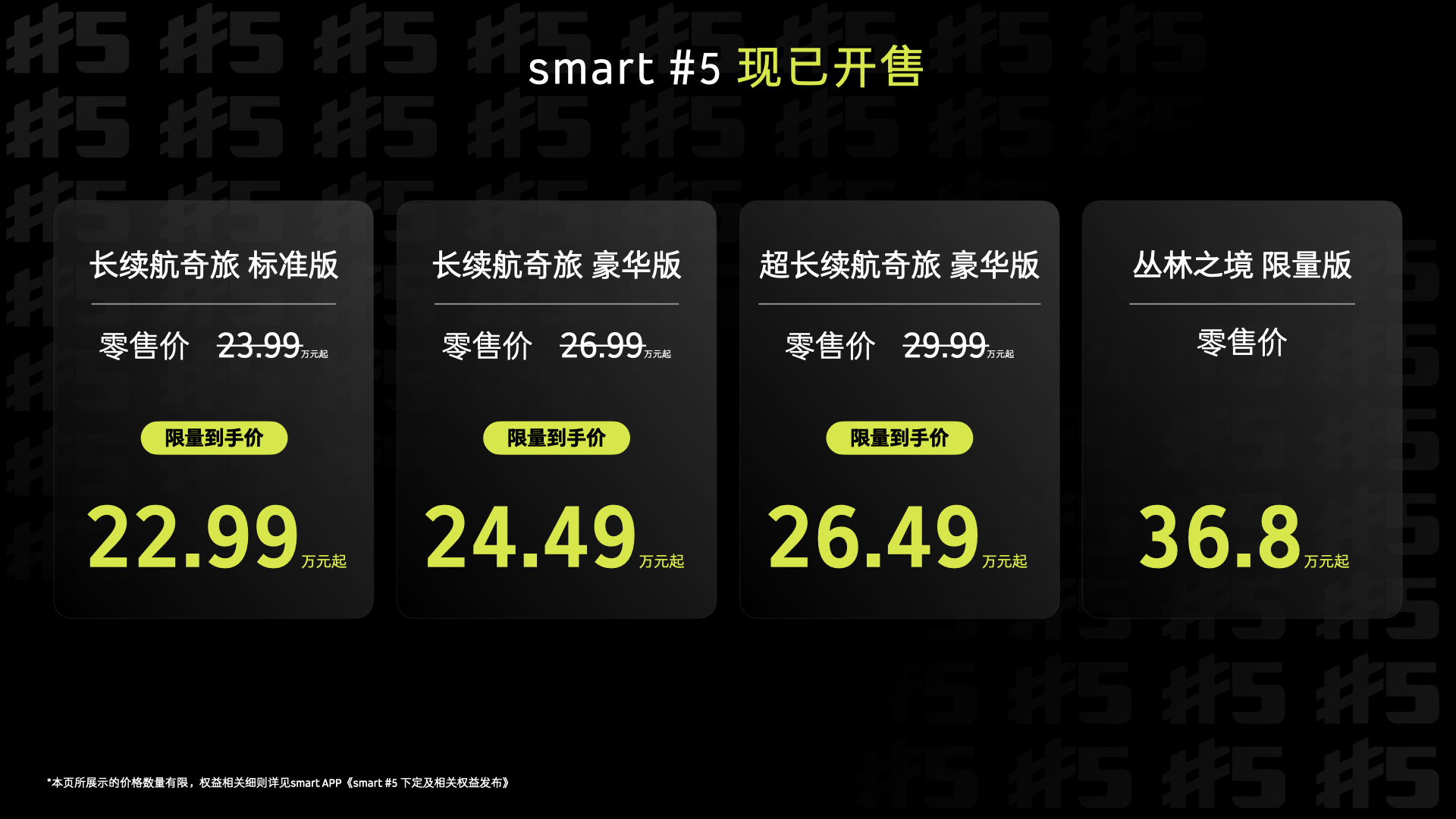 在同時舉行的發佈會上,smart精靈5號正式宣告上市。新車共推出了四款車型,官方指導價23.99萬—36.8萬。