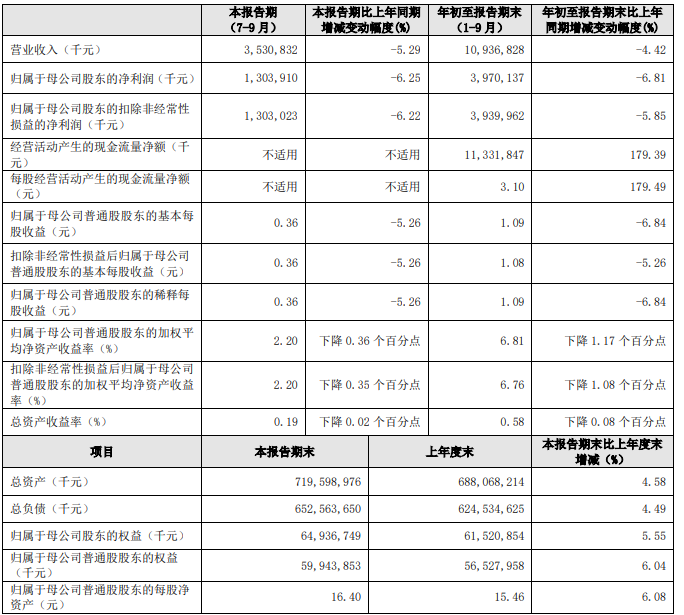 7至9月,貴陽銀行實現歸屬於母公司股東的淨利潤13.04億元,同比下降6.25%;1至9月該行實現歸屬於母公司股東的淨利潤39.70億元,同比下降6.81%,實現基本每股收益1.09元。該行加權平均淨資產收益率(年化)9.08%,總資產收益率(年化)0.77%。