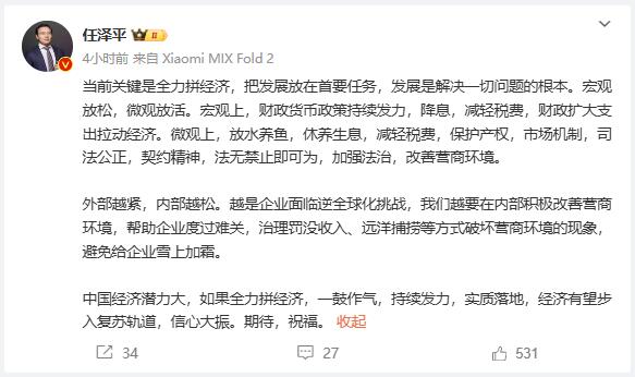 除聲明外,任澤平在另一段微博中表示,中國經濟潛力大,如果全力拼經濟,一鼓作氣,持續發力,實質落地,經濟有望步入復甦軌道,信心大振。
