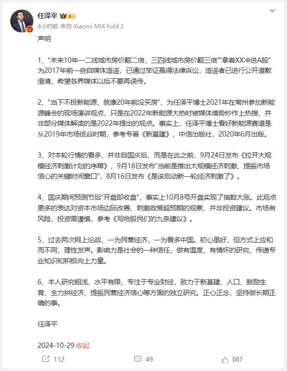 10月29日,網紅經濟學家任澤平就近期網傳言論發佈長文進行回應。而此前,任澤平已在互聯網上“消失”半個月。