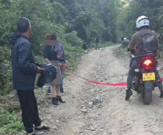 另一段2分59秒視頻中,兩名男子拉着紅繩站在公路兩端將摩托車和小車攔住,那名女子與該頭盔男發生爭執,女子稱那條路是她修的,要求交費才能通過。