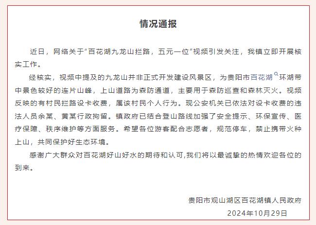 經核實,視頻中提及的九龍山並非正式開發建設風景區,為貴陽市百花湖環湖帶中景色較好的連片山峯,上山道路為森防通道,主要用於森防巡查和森林滅火。視頻反映的有村民攔路設卡收費,屬該村民個人行為。現公安機關已依法對設卡收費的違法人員餘某、黃某行政拘留。鎮政府已結合登山路線加強了安全提示、環保宣傳、醫療保障、秩序維護等方面服務。希望各位遊客配合志願者,規範停車,禁止攜帶火種上山,共同保護好生態環境。