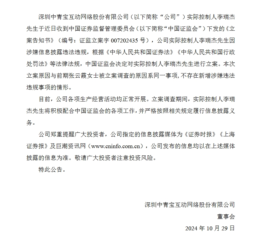 10月29日晚,深圳中青寶互動網絡股份有限公司(以下簡稱中青寶)發佈公告稱,因涉嫌信息披露違法違規,根據相關法律法規,中國證監會決定對該公司實際控制人李瑞傑進行立案。值得注意的是,中青寶稱,本次立案原因與前期張雲霞被立案調查的原因系同一事項,不存在新增涉嫌違法違規事項的情形。而李瑞傑、張雲霞為夫妻關係。