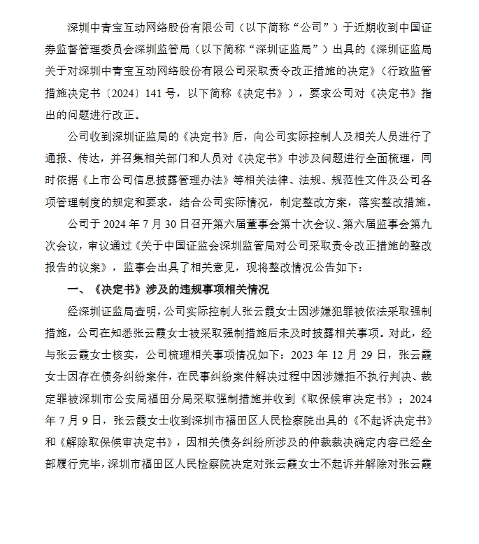 因為在知悉張雲霞被採取強制措施後未及時披露相關事項,中青寶還收到了深圳證監局的行政監管措施決定書。