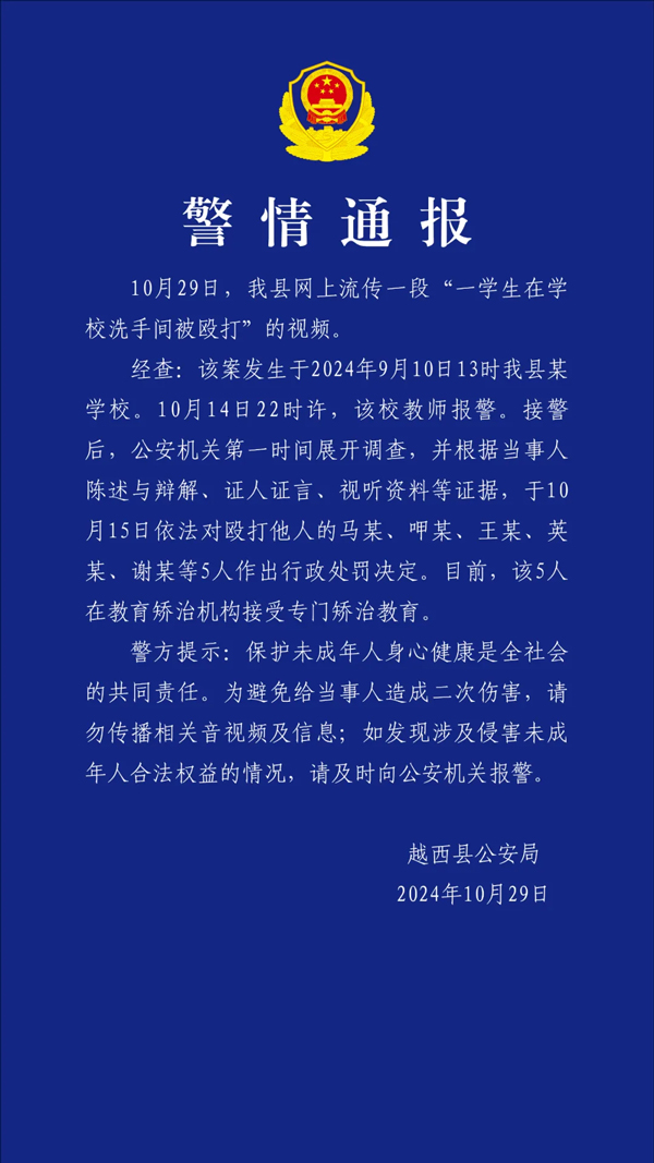 一學生在校洗手間被毆打?四川越西警方通報:5人被行政處罰,接受專門矯治教育