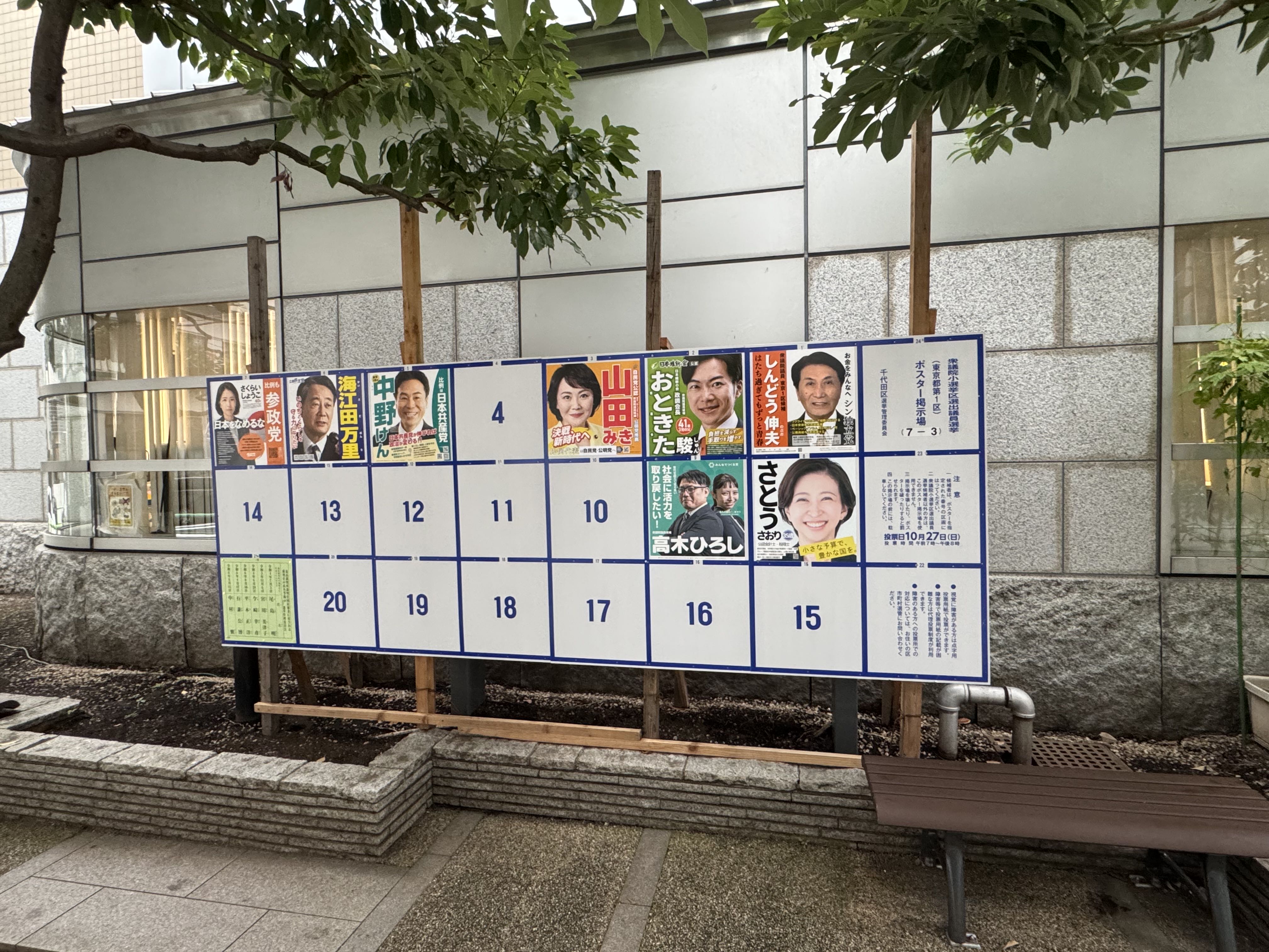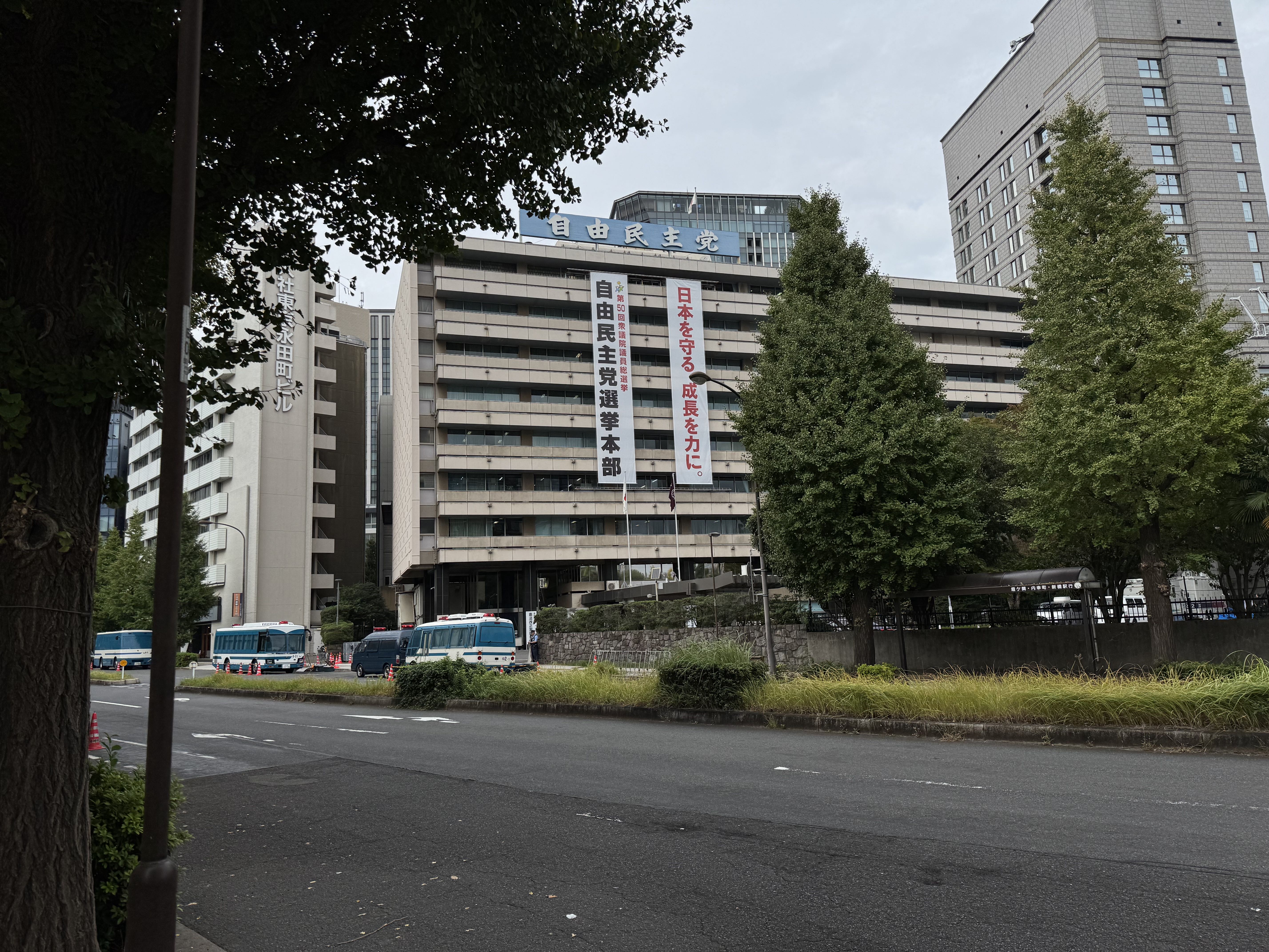 10月27日投票當天,路過東京市中心的一些投票所門口,看到有人進去投票,但場面也只能説是波瀾不驚。下午,正好經過自民黨總部附近,便繞道過去看了看,除了門口的直播車、警視廳的機動隊之外,也是冷冷清清。