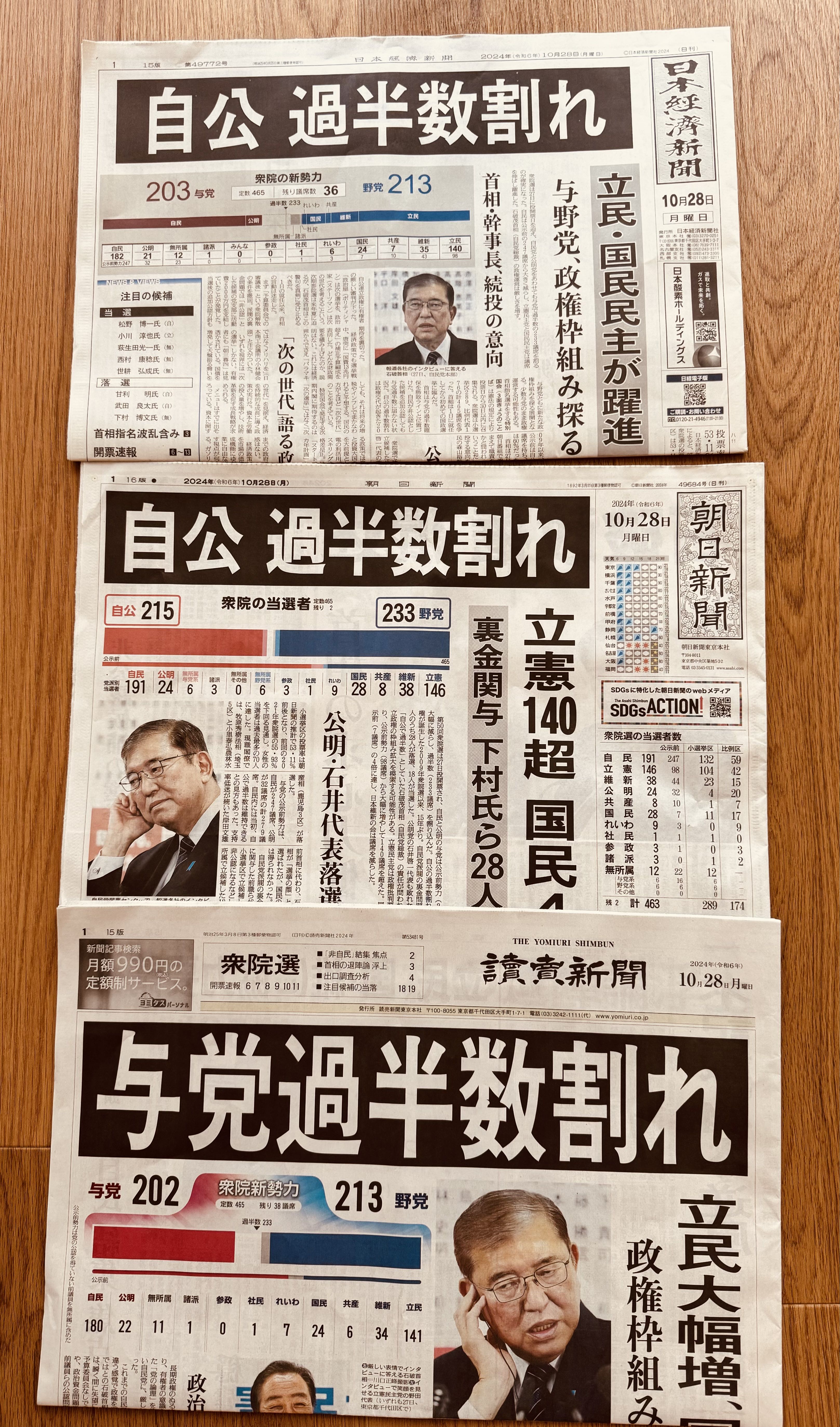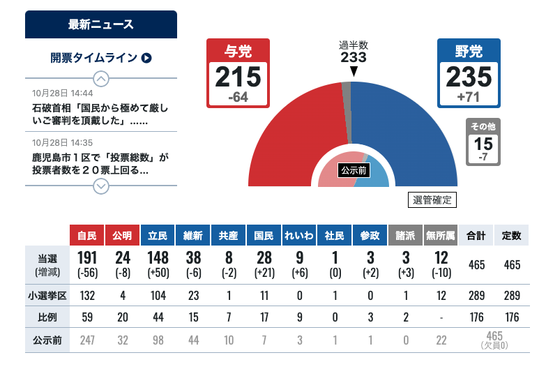 選舉開票到深夜,自民黨與公明黨聯合政權在日本國會議席不過半,已是板上釘釘。這是2009年以來的第一次;而且過去長期以來,自民黨甚至能保持一黨單獨過半。