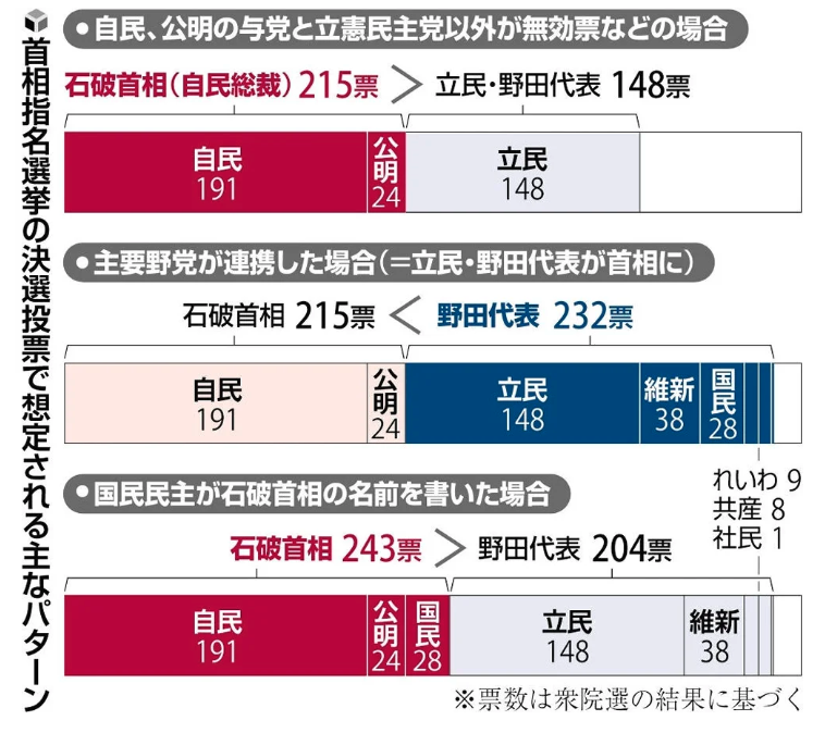 假設這次自公聯盟和立憲民主黨都沒有與其他政黨達成組閣協議,首相指名選舉的決勝輪投票將充滿變數。日經新聞預測,日本維新會和國民民主黨等在野黨將在第一輪投票給各自黨首,第二輪可能會投出空白票。